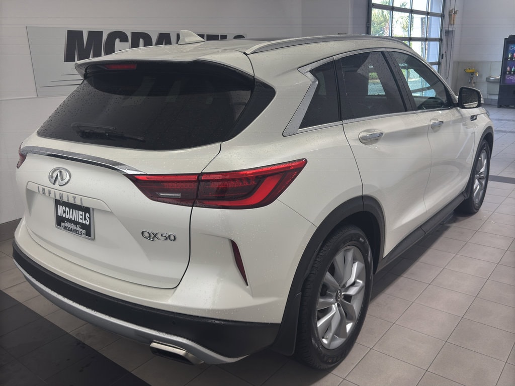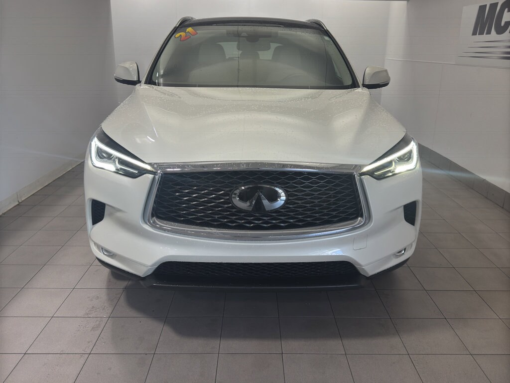 This mid-size suv offers Android Auto for seamless smartphone integration. This unit offers Apple CarPlay for seamless connectivity. The vehicle keeps you comfortable with Auto Climate. This model has an automatic transmission. See what's behind you with the back up camera on this vehicle. This 2021 INFINITI QX50 has a clean CARFAX vehicle history report. Set the temperature exactly where you are most comfortable in this mid-size suv. The fan speed and temperature will automatically adjust to maintain your preferred zone climate. Easily set your speed in the vehicle with a state of the art cruise control system. Increase or decrease velocity with the touch of a button. Electronic Stability Control is one of many advanced safety features on this vehicle. The vehicle has a 4 Cyl, 2.0L high output engine. The fog lights cut through the weather so you can see what's ahead. It's Forward Collision Warning system alerts the driver to potential front-end collisions, enhancing safety. Front wheel drive on this vehicle gives you better traction and better fuel economy. This vehicle is equipped with a gasoline engine. Bluetooth technology is built into this mid-size suv, keeping your hands on the steering wheel and your focus on the road. The leather seats in this 2021 INFINITI QX50 are a must for buyers looking for comfort, durability, and style. Help alleviate lower back pain with the driver seat lumbar support in the vehicle. This mid-sized SUV is perfect for your next adventure. Load groceries and much more with ease into this model thanks to the power liftgate. The state of the art park assist system will guide you easily into any spot. The vehicle embodies class and sophistication with its refined white exterior.